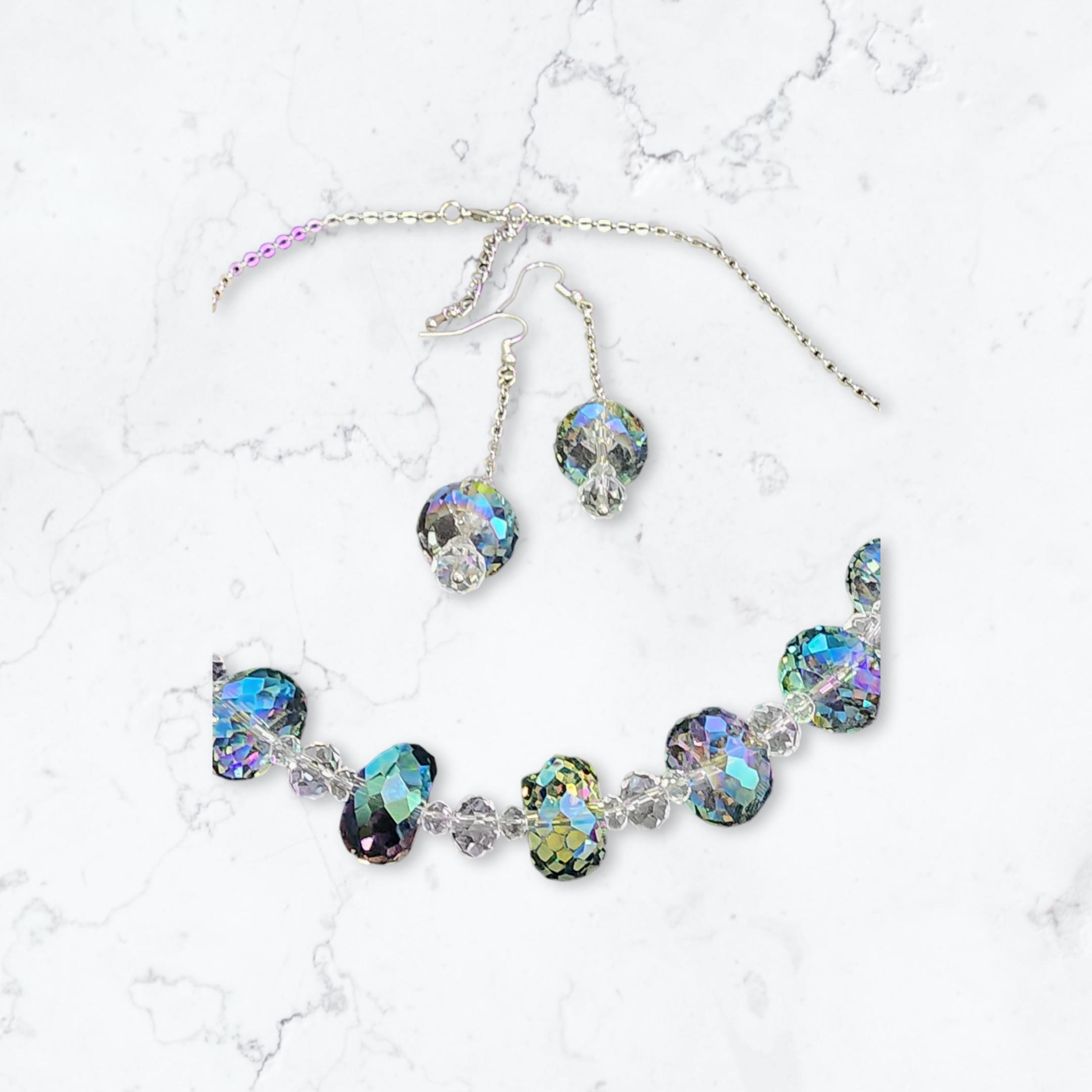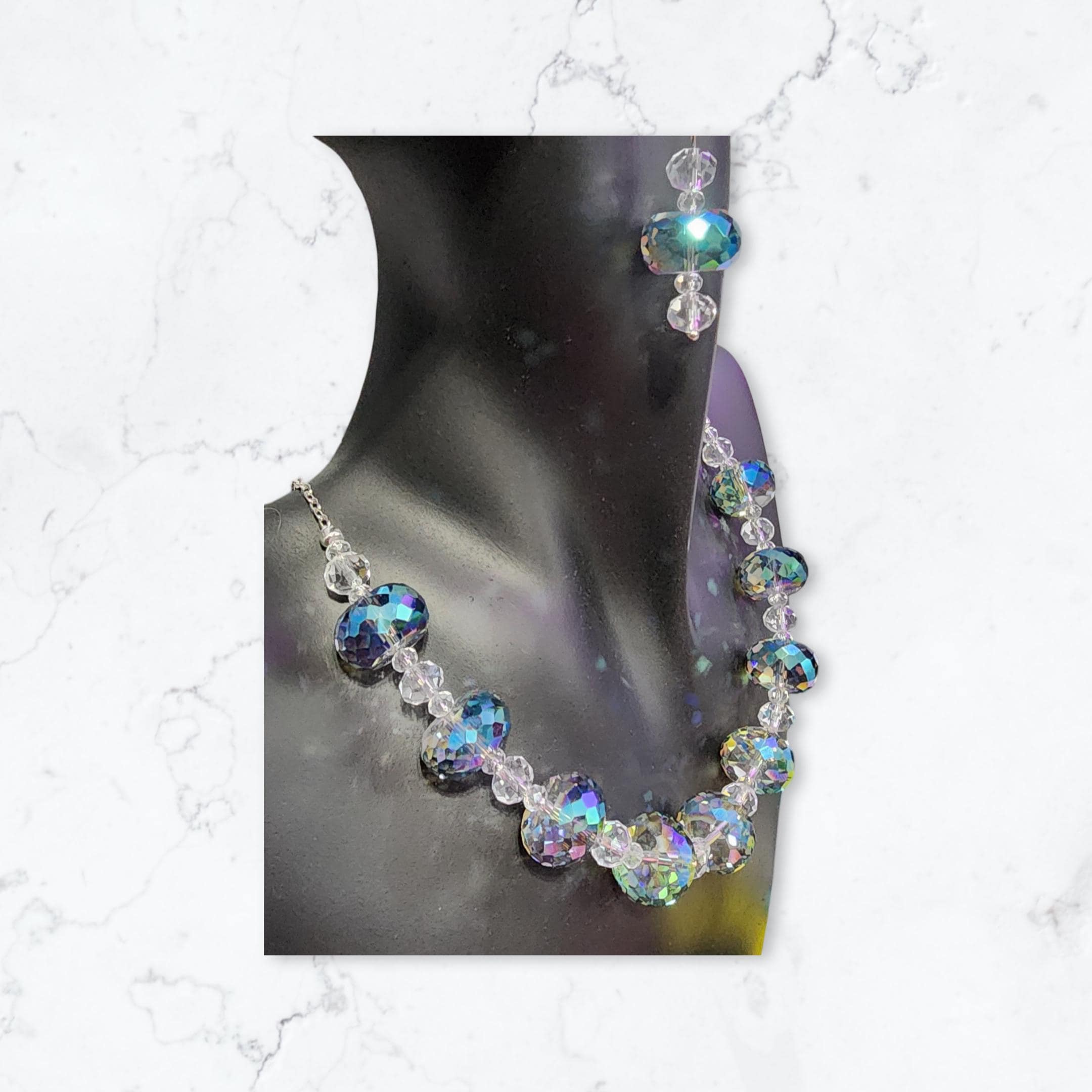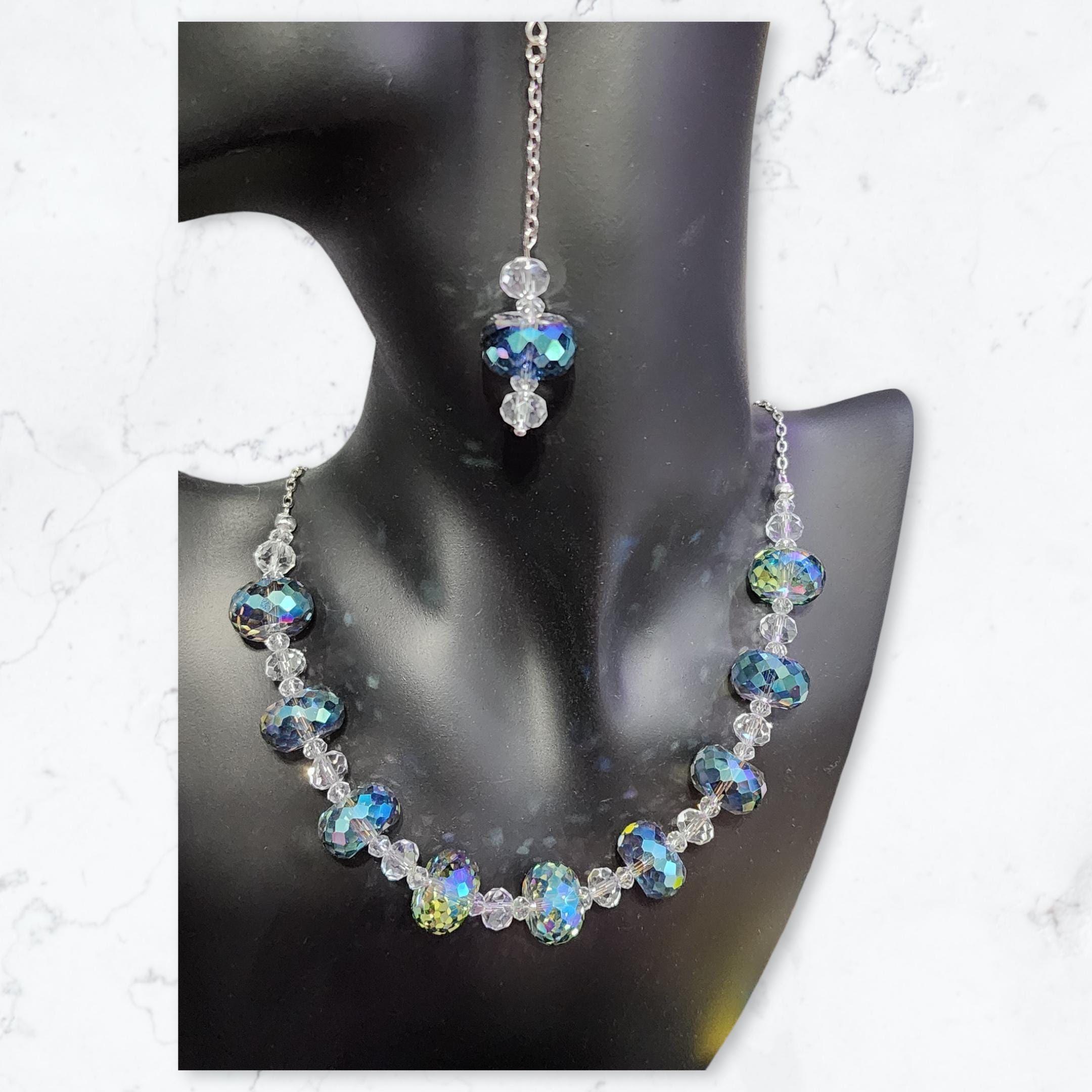 Make a statement with this adjustable 16-inch (extends to 18") choker-style chunky necklace and earring set. Both are handmade with faceted crystal glass beads and spacers. The earrings are 1.5 inches. See more designs at: prettybeaddezigns.com