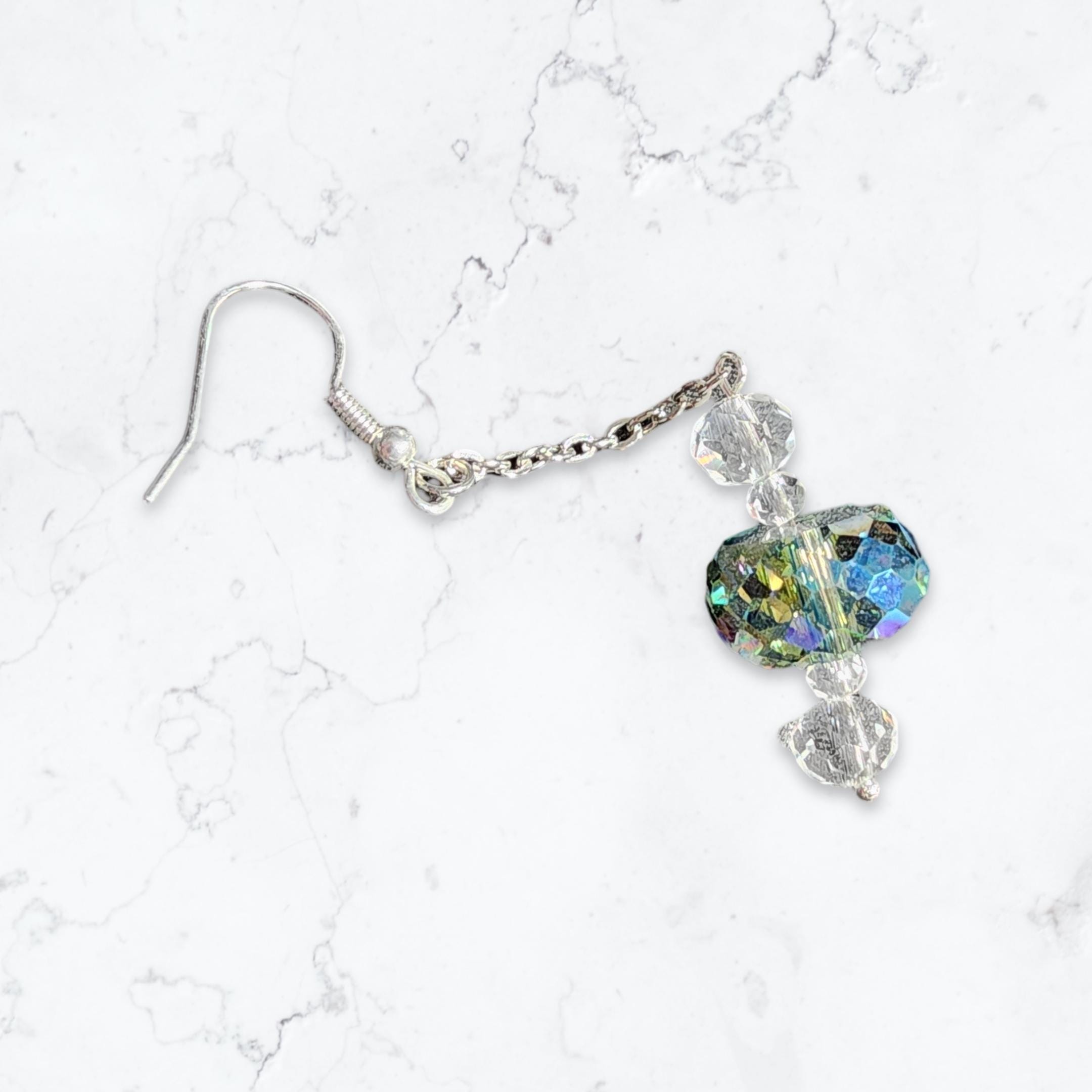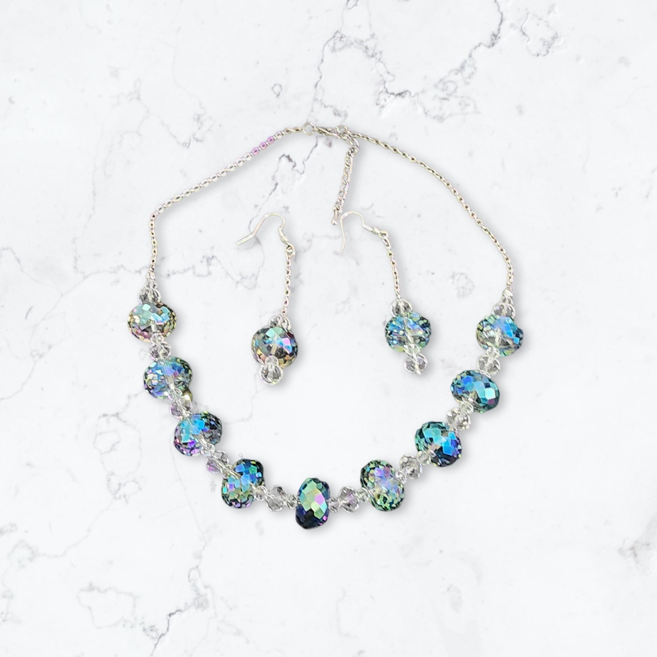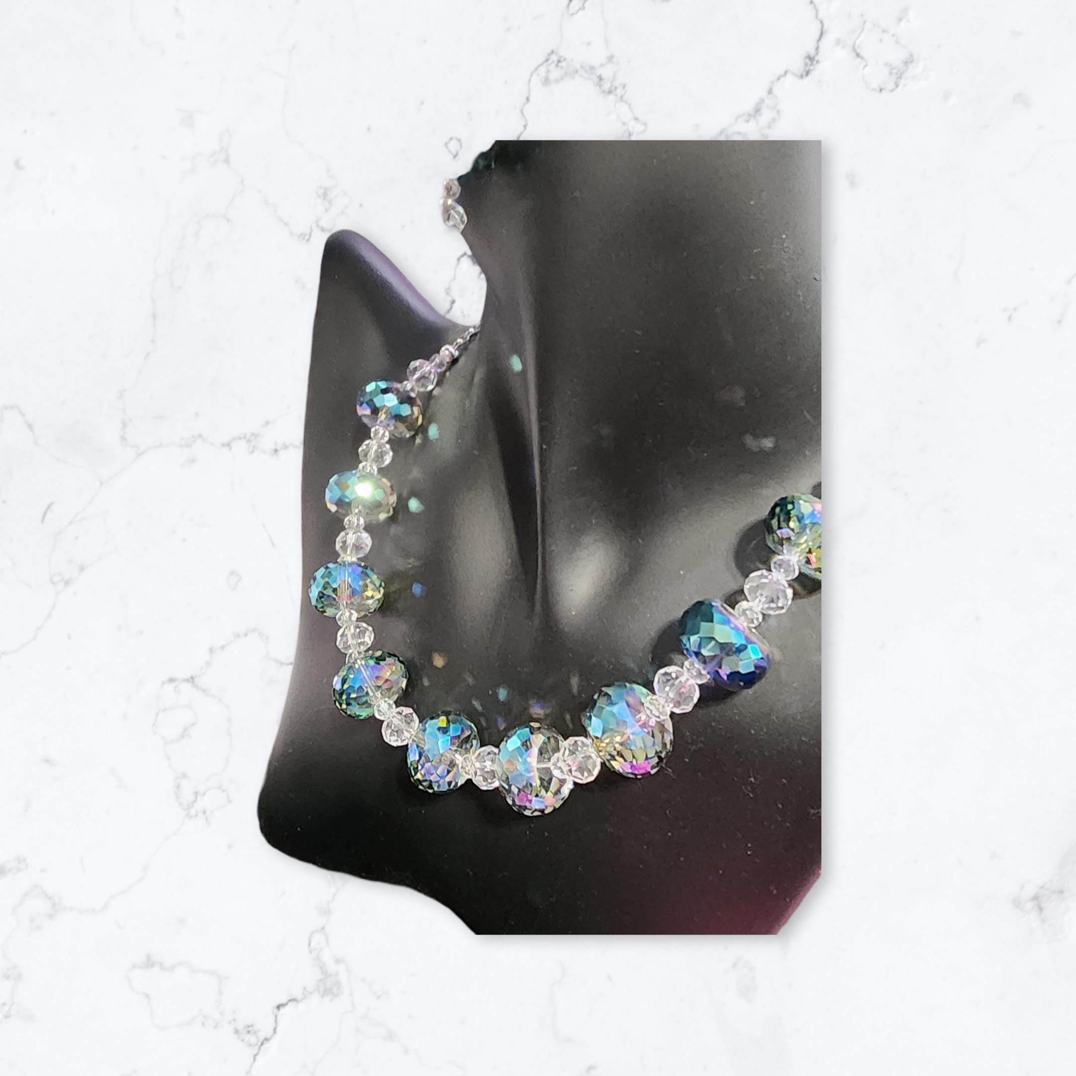 Make a statement with this adjustable 16-inch (extends to 18") choker-style chunky necklace and earring set. Both are handmade with faceted crystal glass beads and spacers. The earrings are 1.5 inches. See more designs at: prettybeaddezigns.com