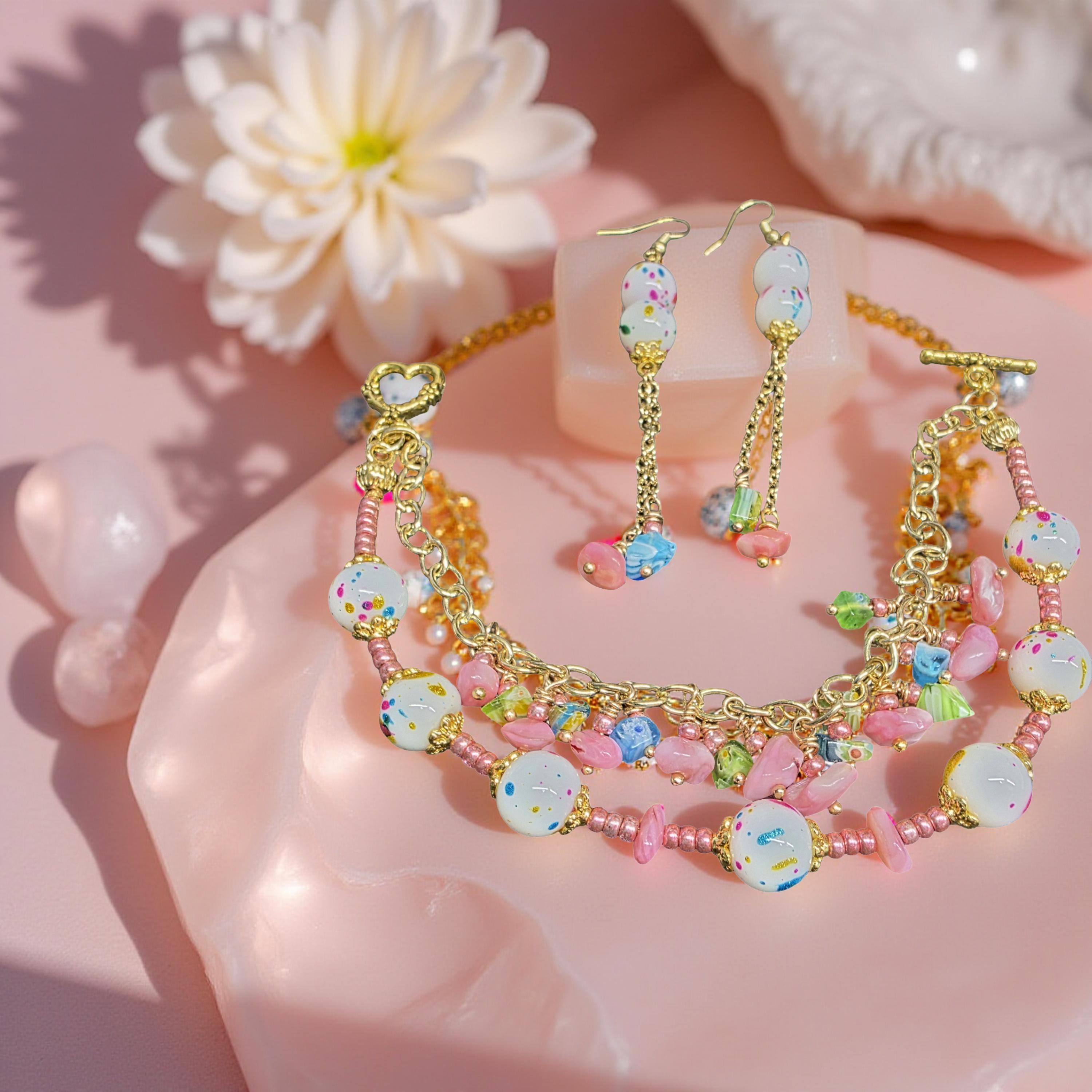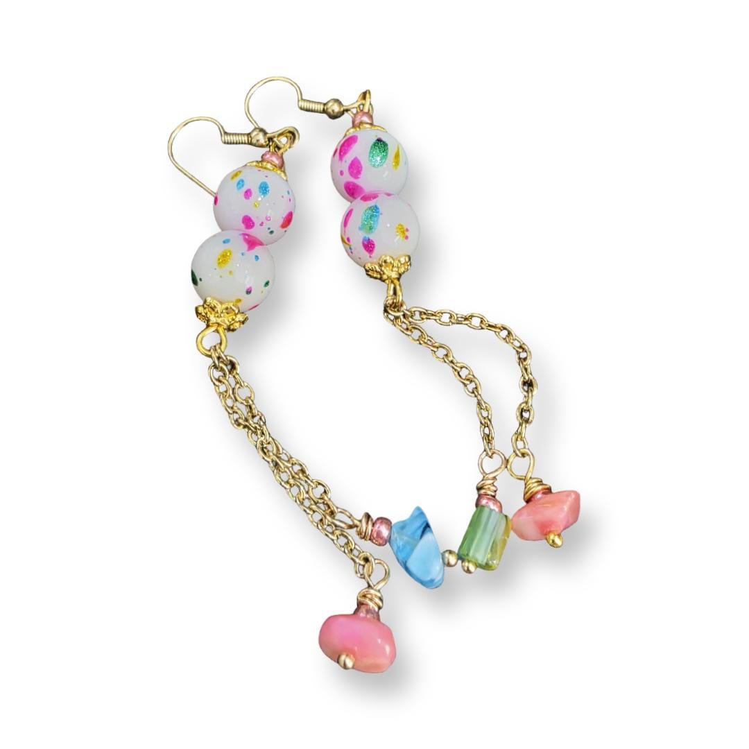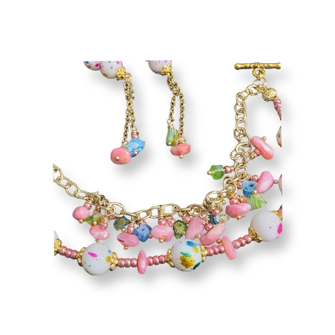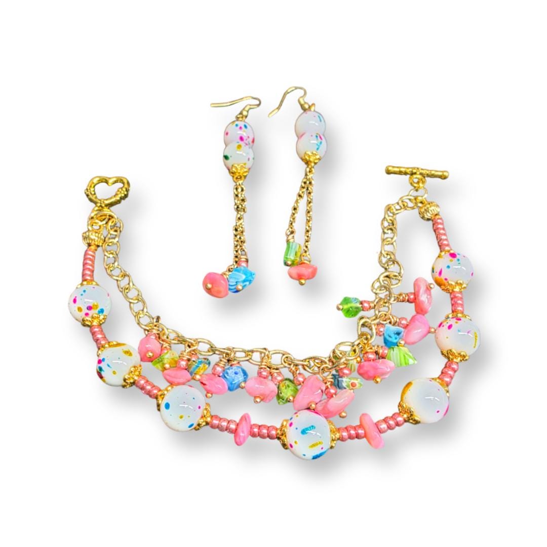 Cute double-strand bracelet and dangle earrings handmade with confetti glass beads, Preciosa beads, natural shell chips in pink, blue, and green, on a gold chain. The bracelet is 7" and the earrings dangle 3.5". See more designs at: www.prettybeaddezigns.com