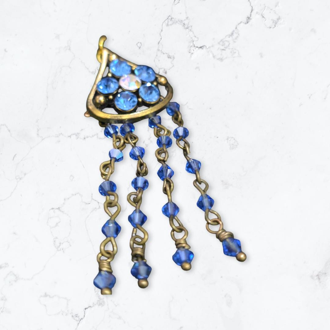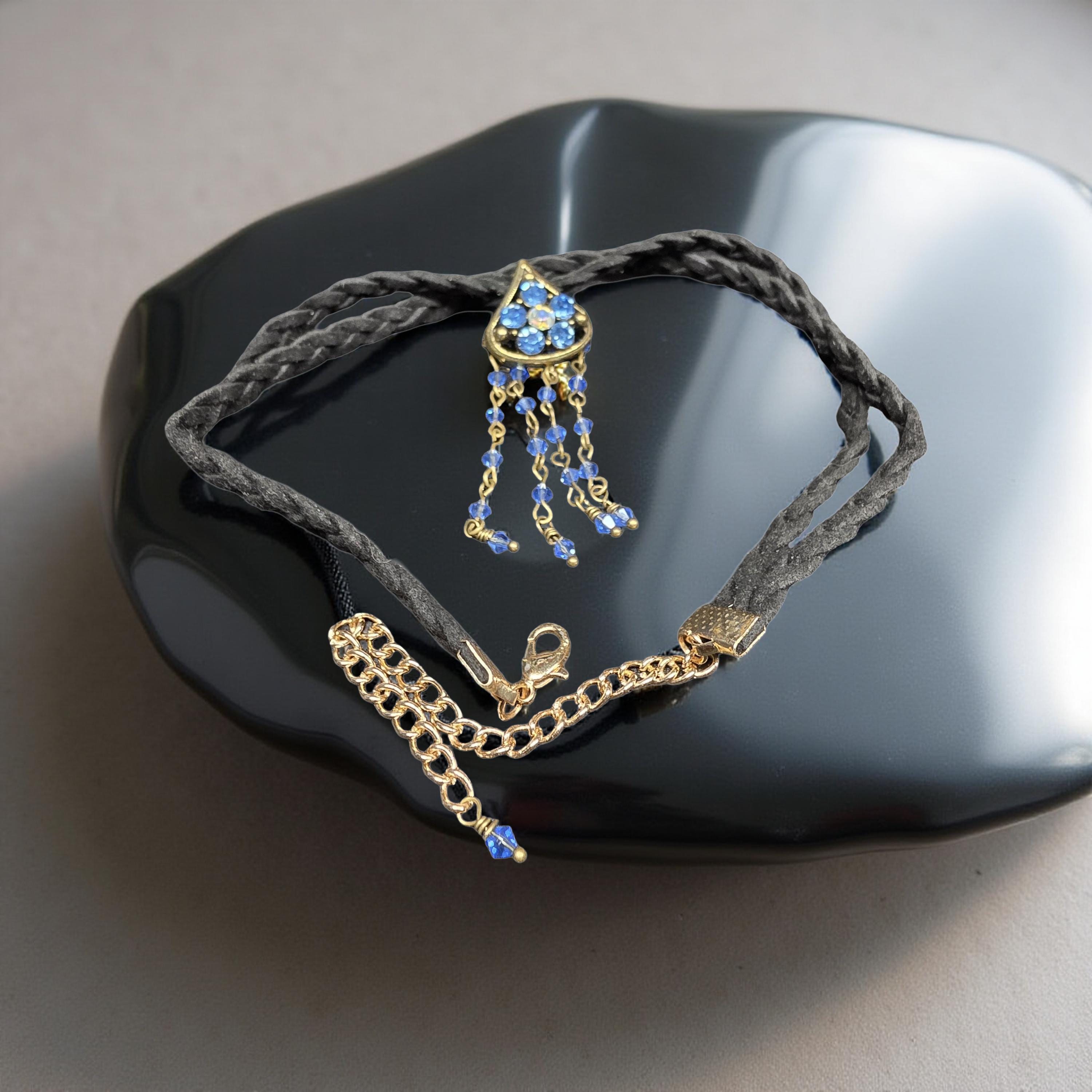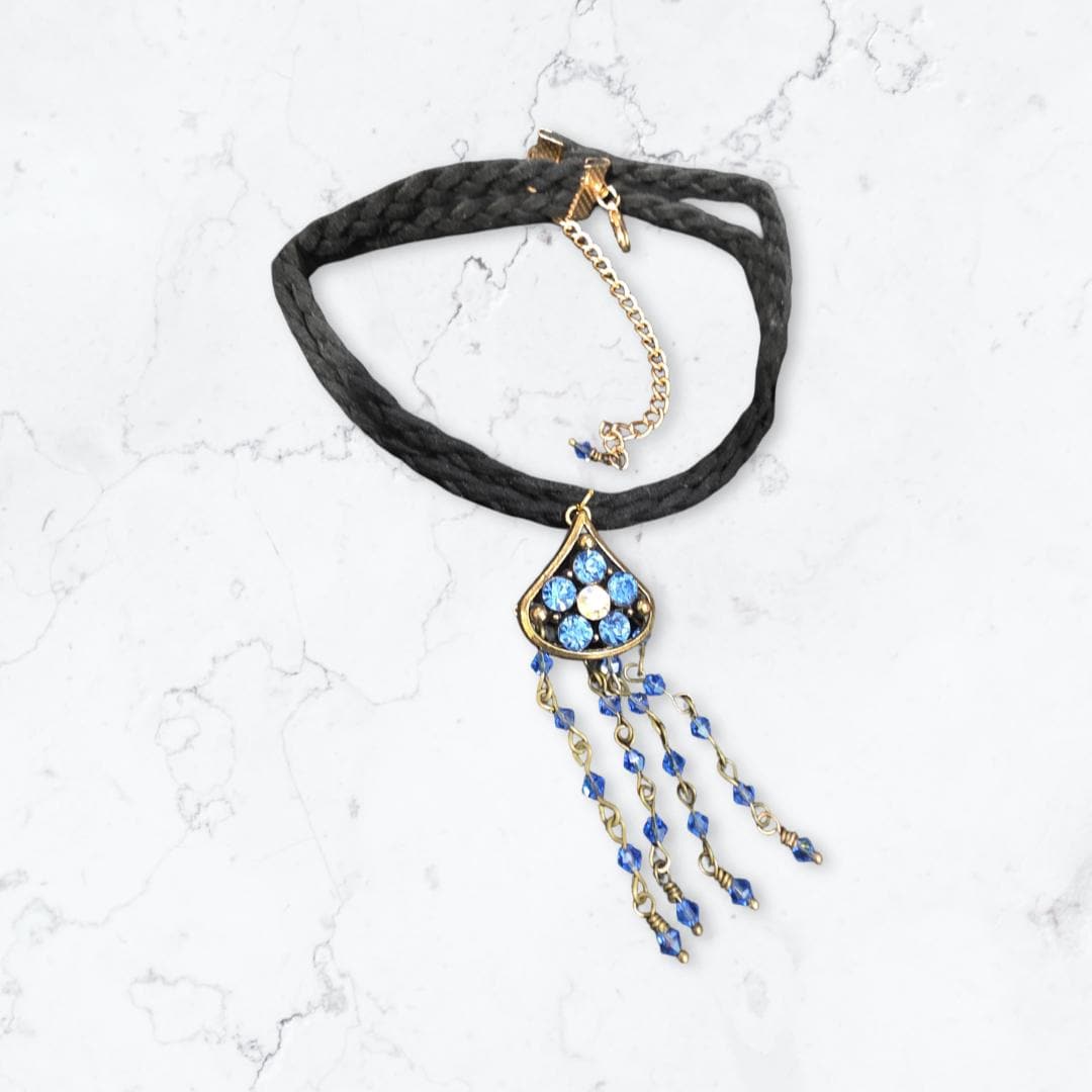Beautiful choker handmade with black braided faux suede cord, sparkling blue rhinestones in the shape of a flower, blue glass bead dangles, and a 4-inch extender. See more designs at: prettybeaddezigns.com