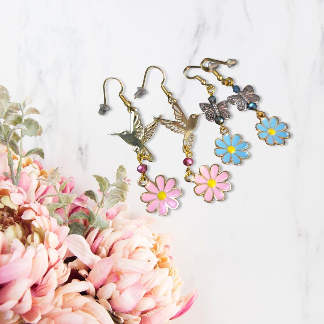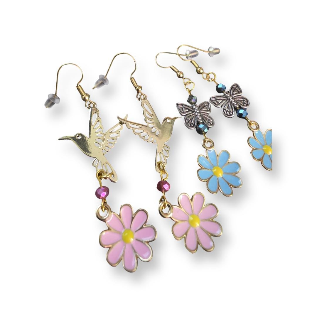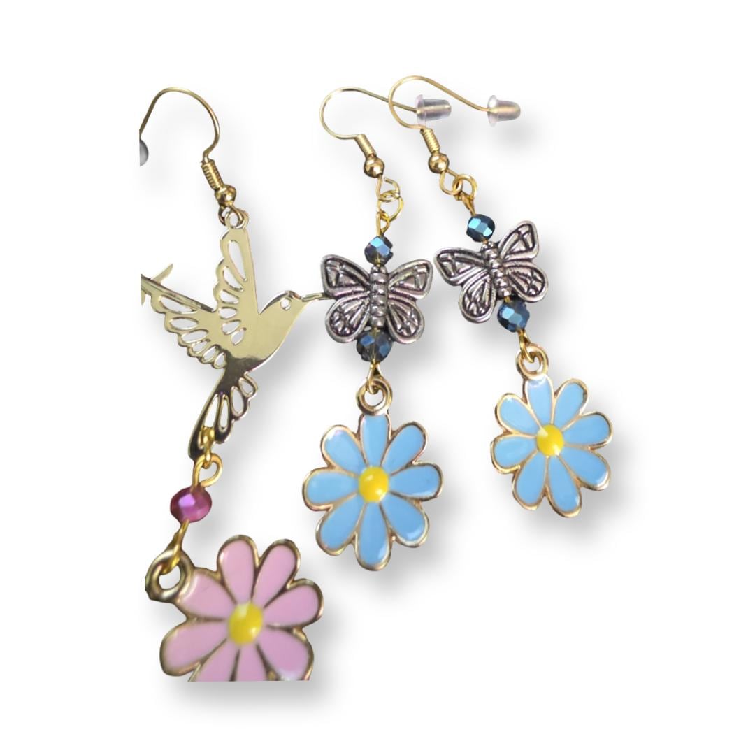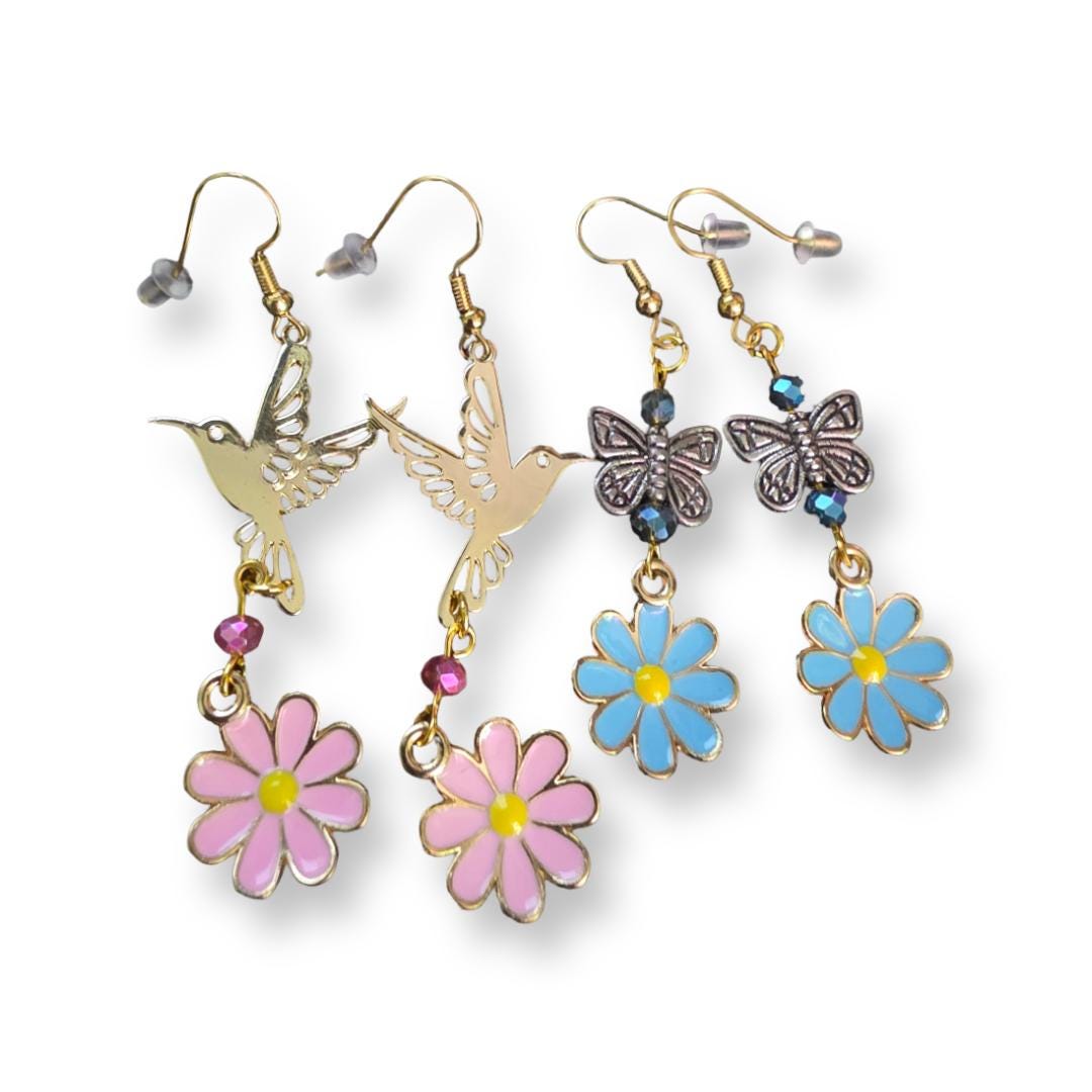 2 pairs of whimsical earrings handmade using hummingbird, butterfly, and flower charms. Length is 2.75 inches. See more designs at: prettybeaddezigns.com