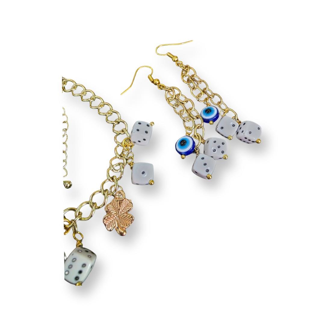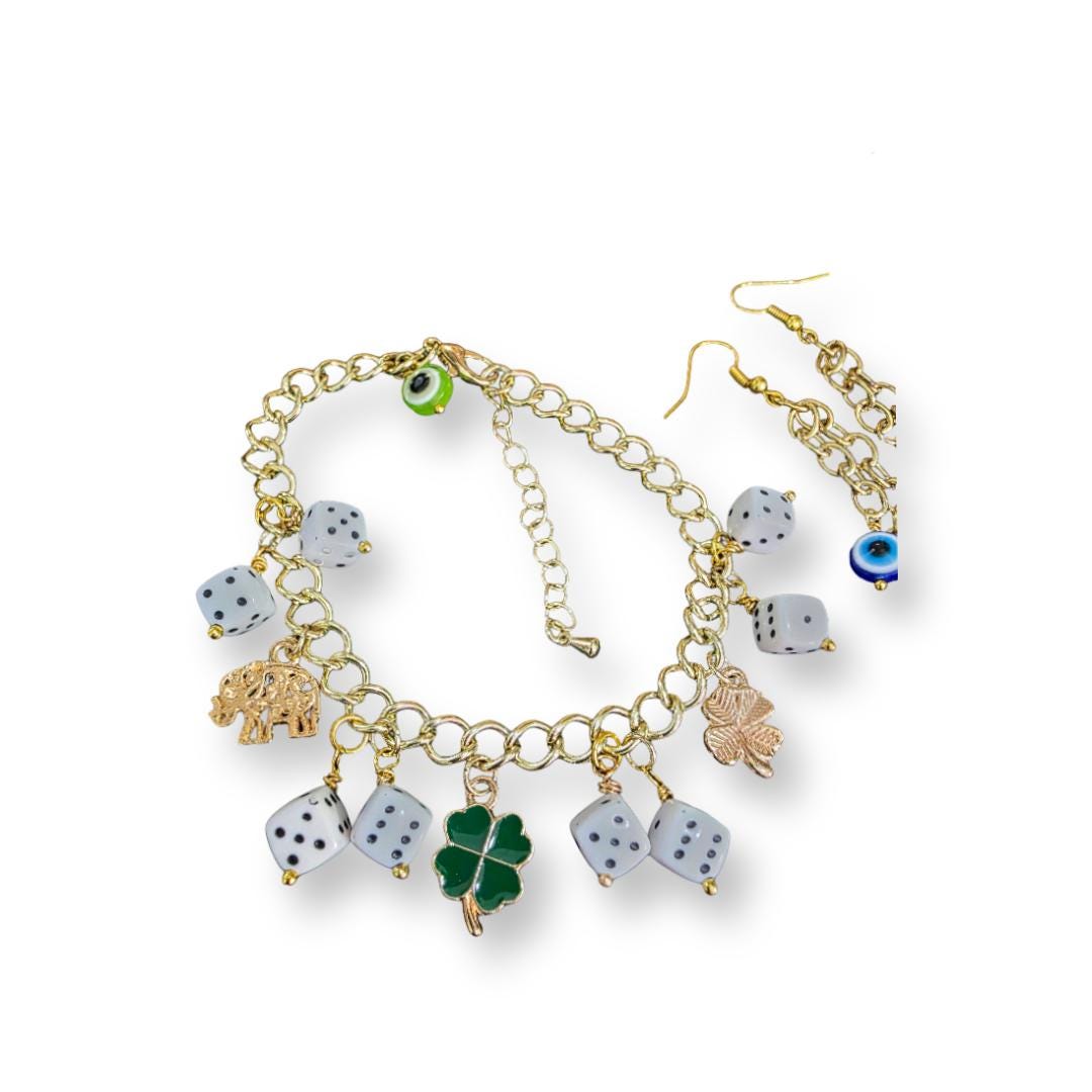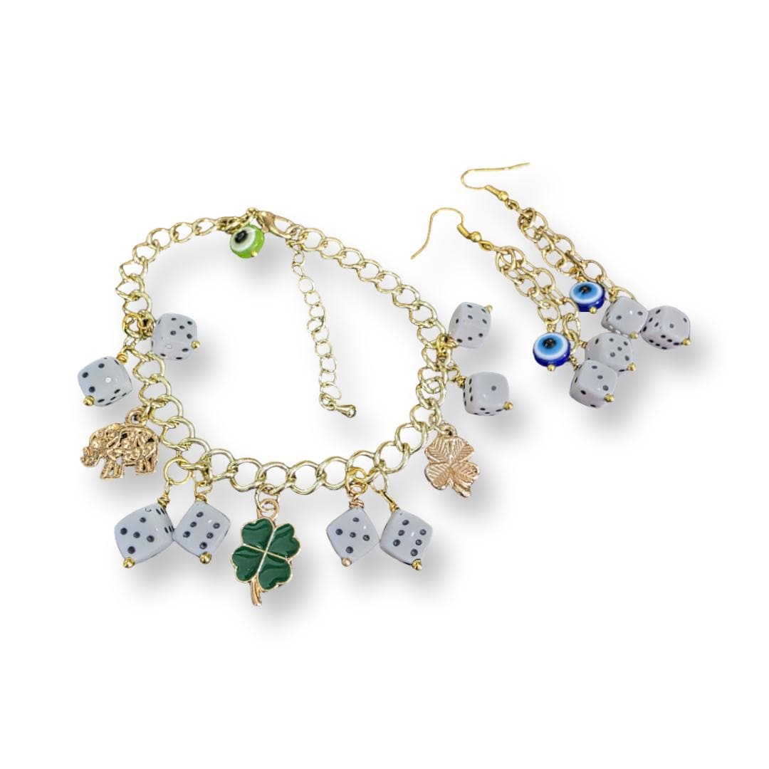 Perfect for a casino night! This bracelet and dangle earring set is handmade with 6 pairs of dice and lucky charms! Size 7 bracelet with a 2-inch extender, the earrings dangle 2.5 inches. See more of my designs at: prettybeaddezigns.com