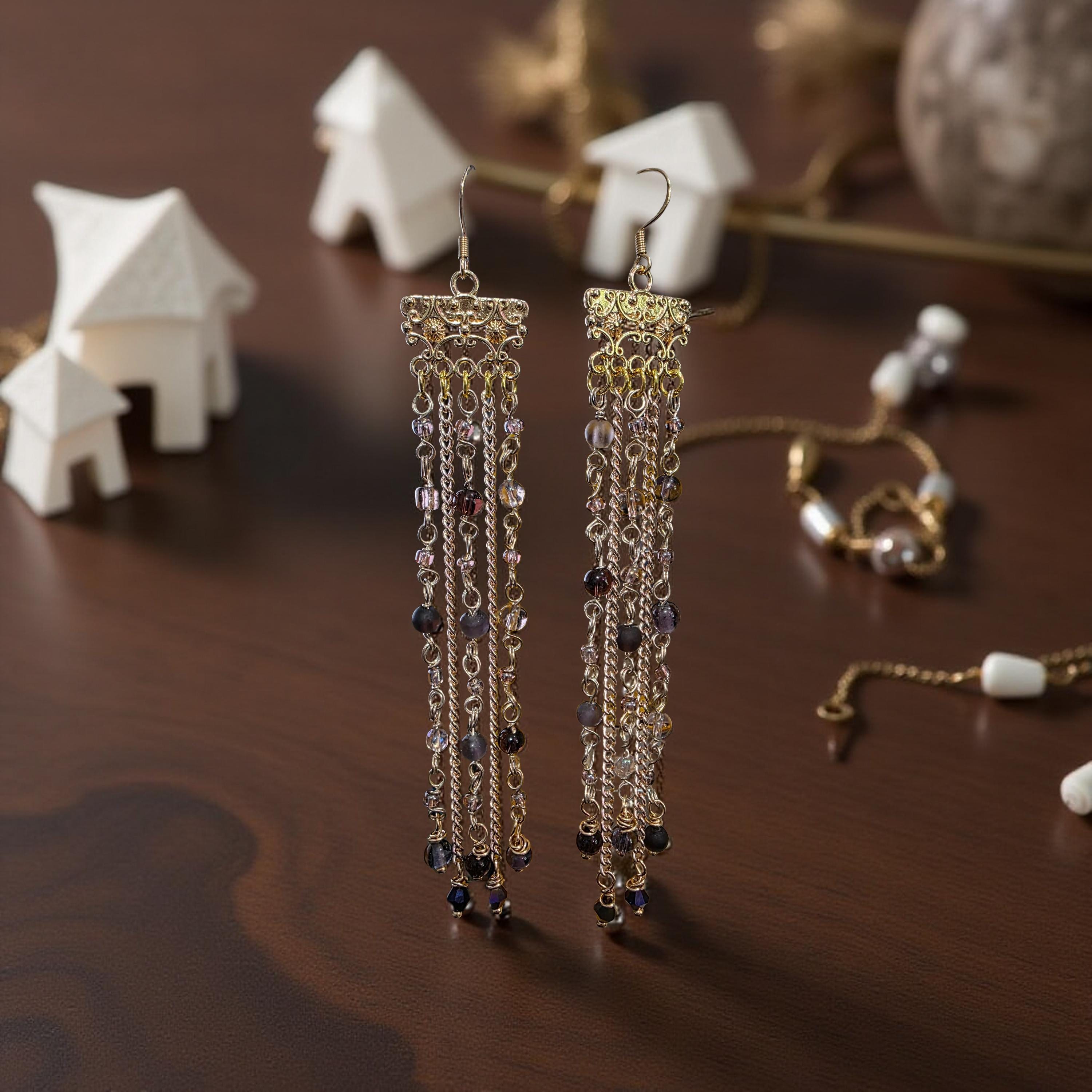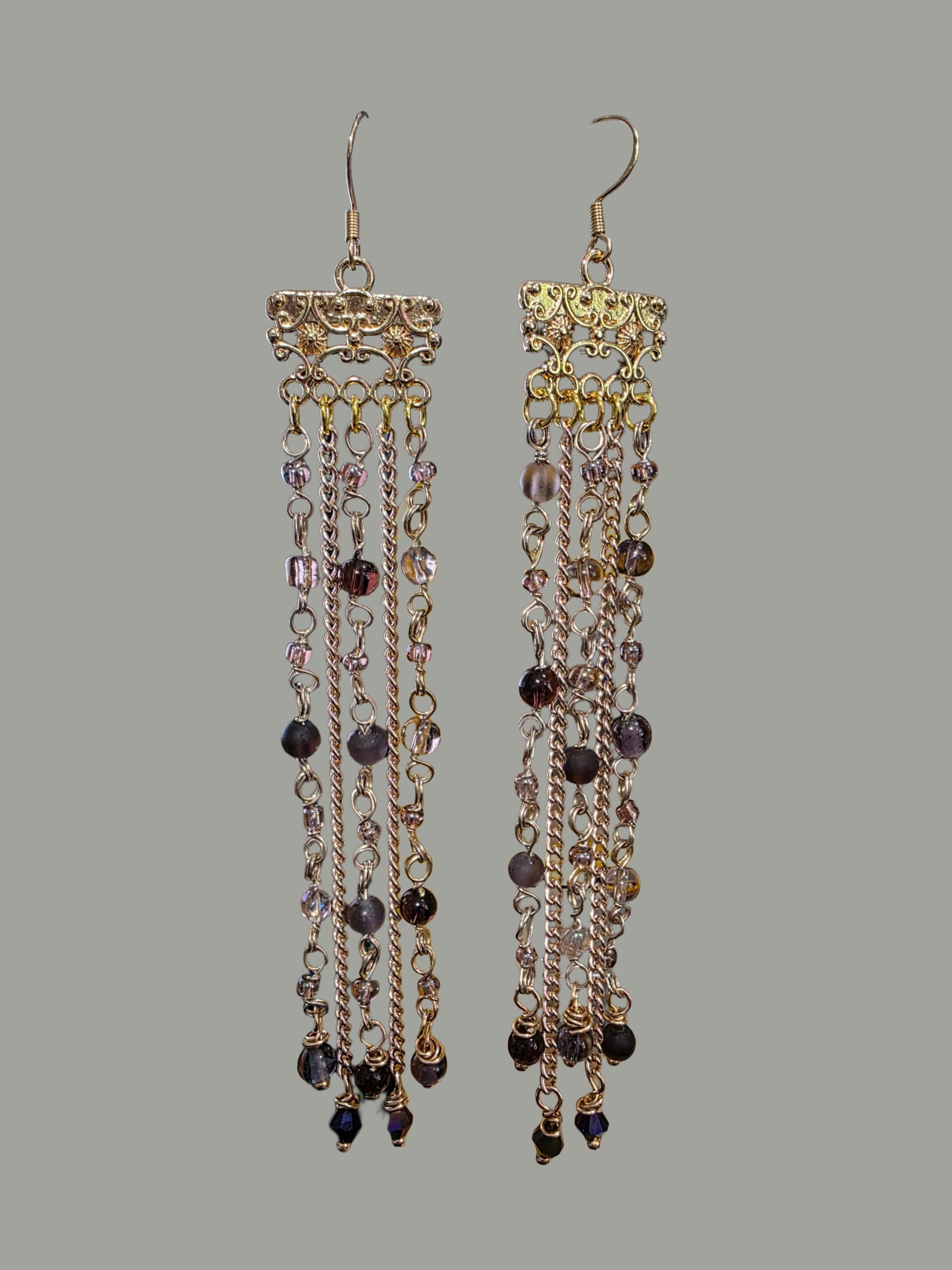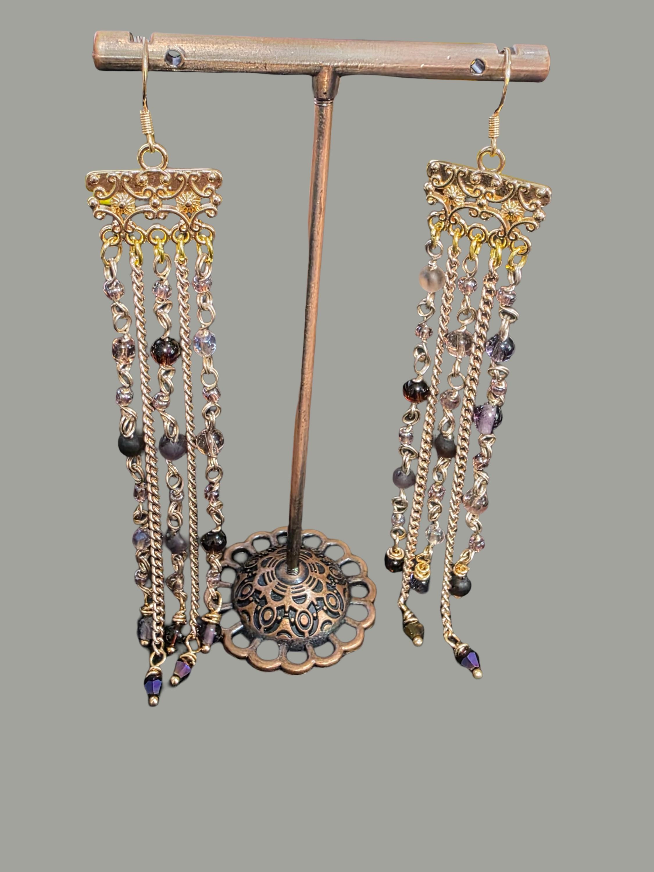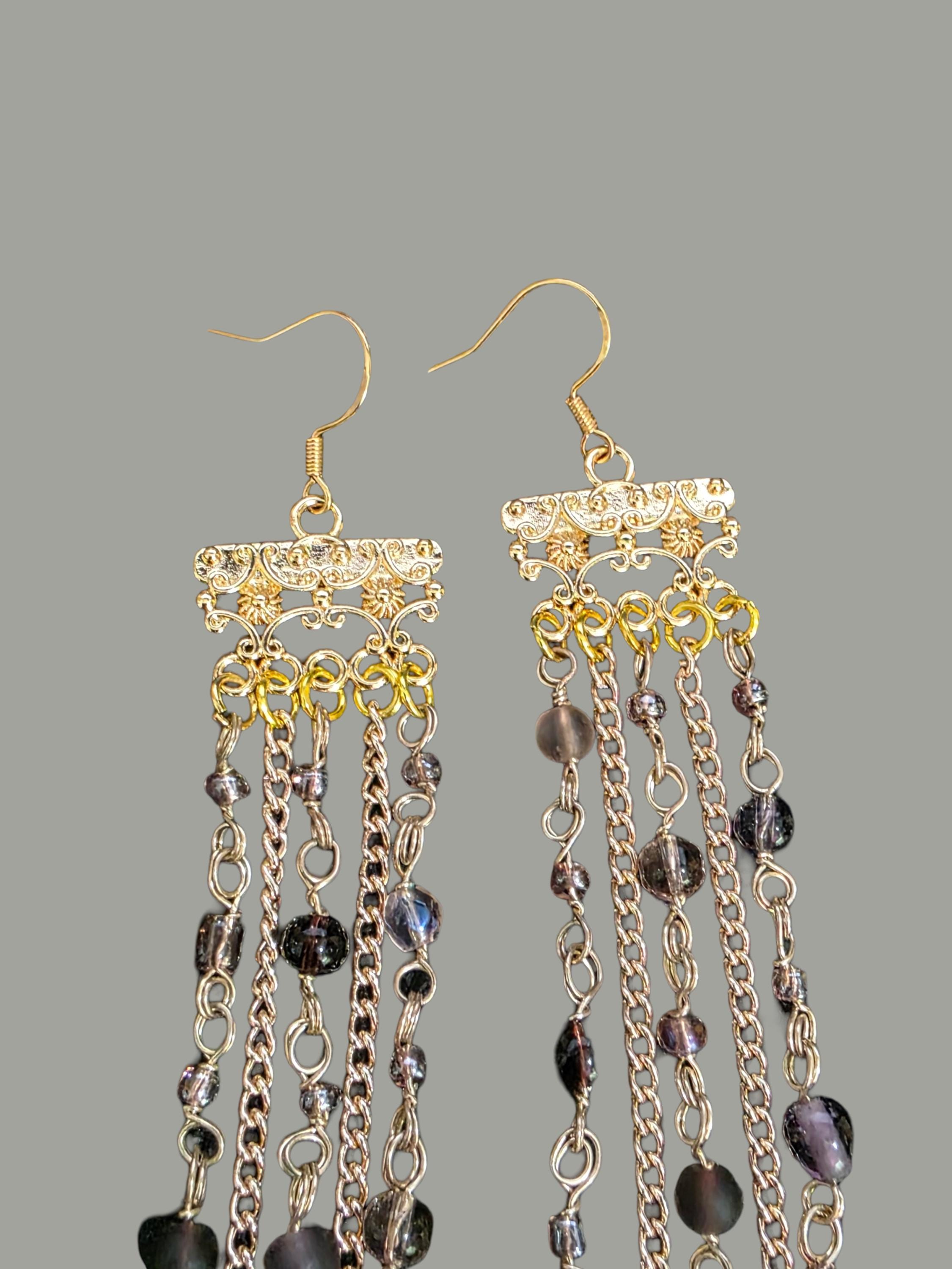 Ornate boho-style 5-strand dangle earrings handmade with random amethyst beads and gold chain that dangle from filigree connectors. The length is just over 4.5 inches. See more of my designs at: prettybeaddezigns.com
