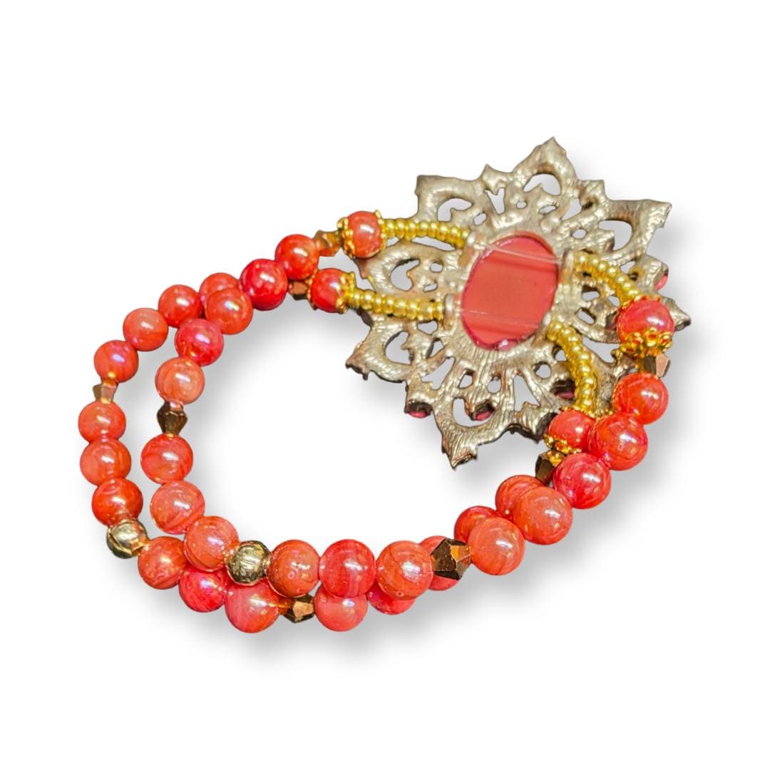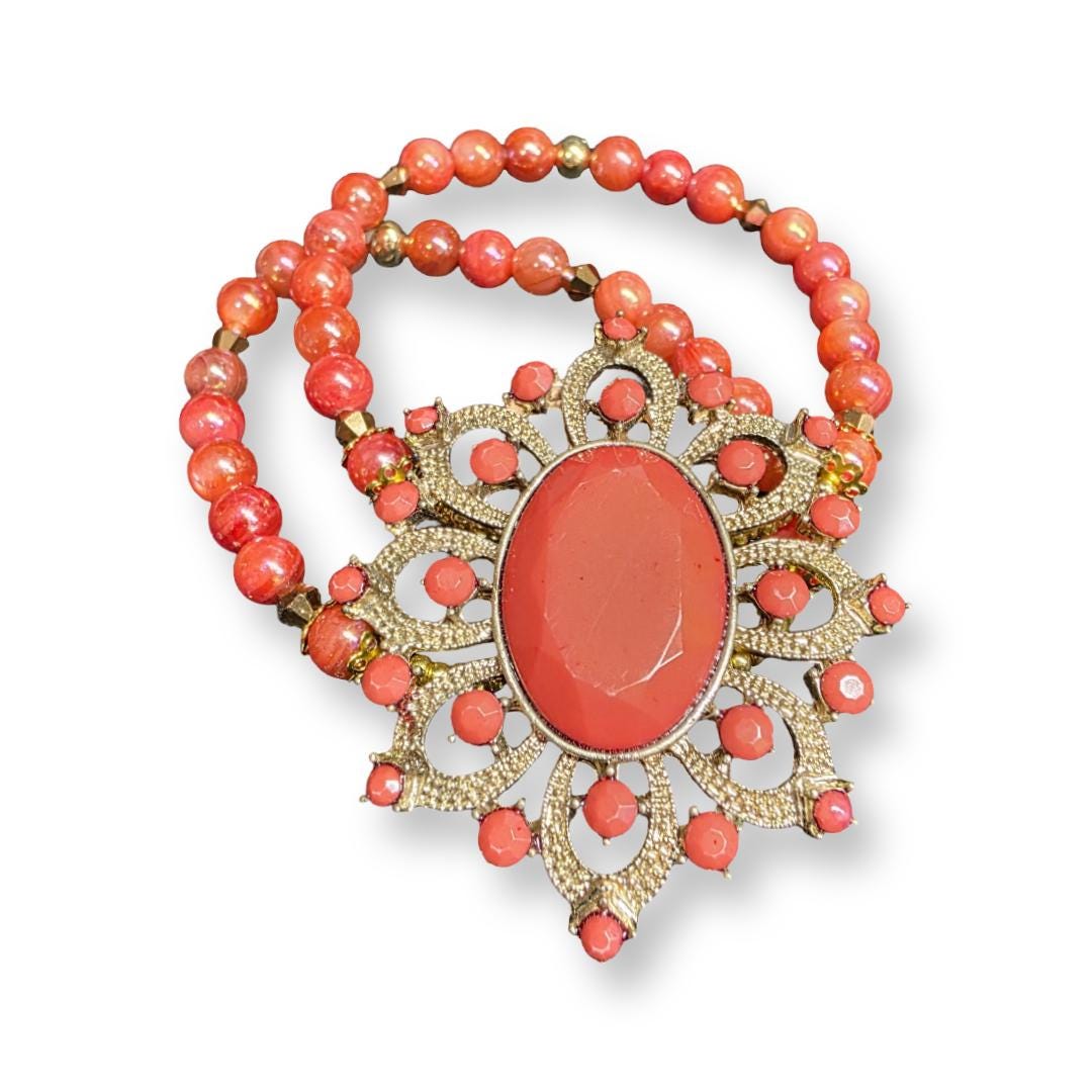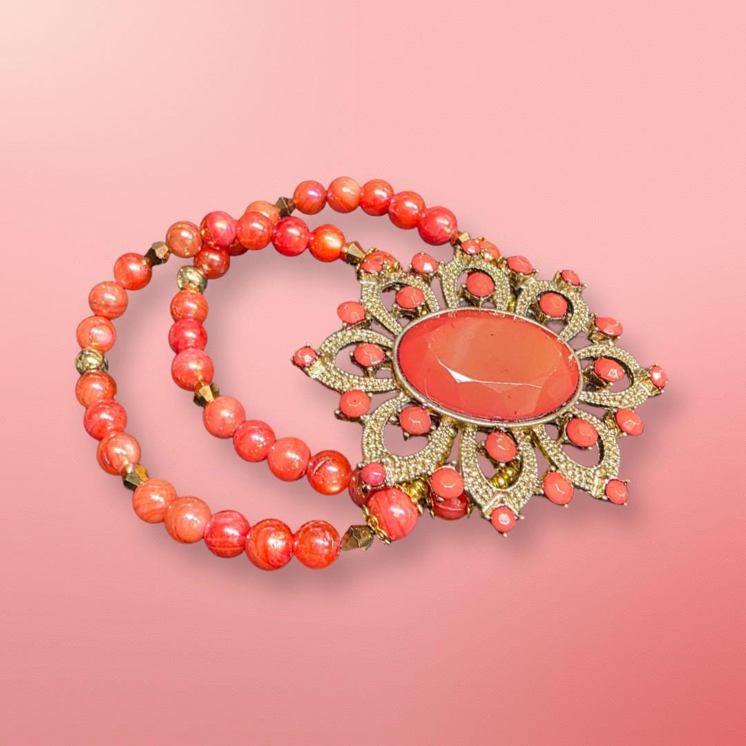Cute stretch bracelet handmade with coral shell beads and a 2-hole pendant. Size is 7 inches. See more designs at: prettybeaddezigns.com