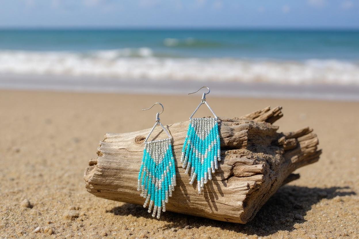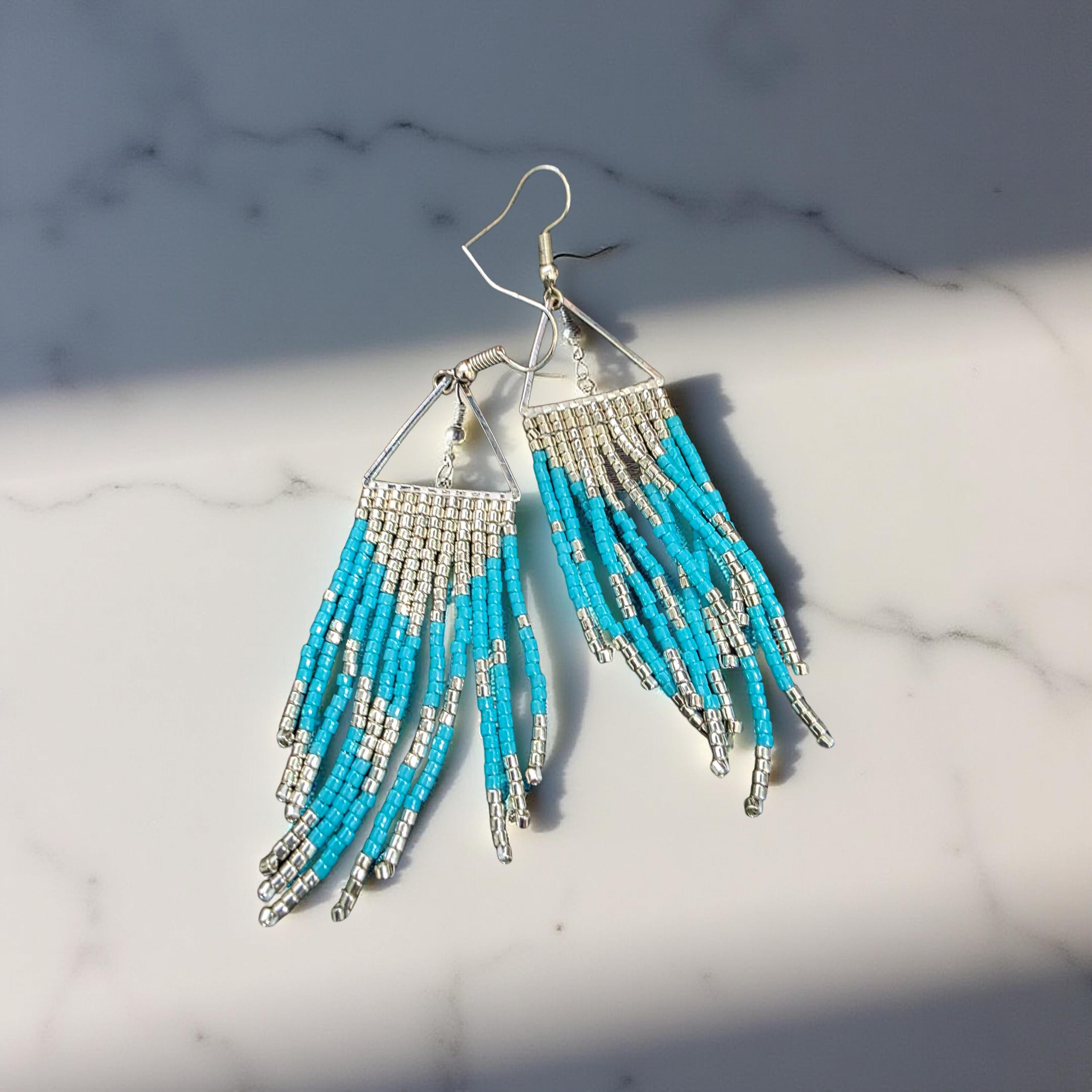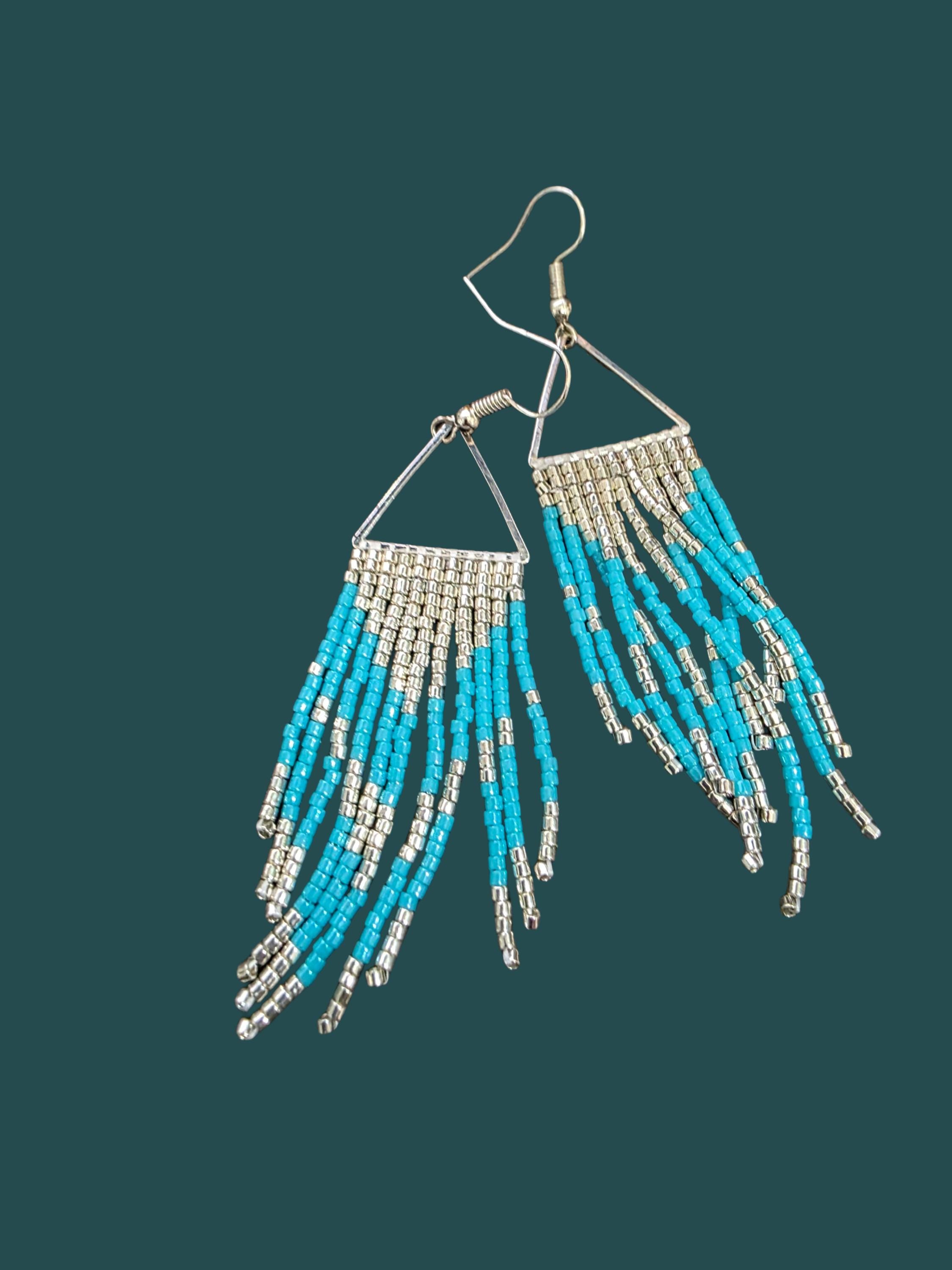 Hand-sewn dangle earrings made with silver triangles, 11 rows of Miyuki Delica beads in colors of silver and aqua blue, and sterling silver ear wires. Length is 3 inches. SKU EA-L3-ST11-STYF. See more at: prettybeaddezigns.com