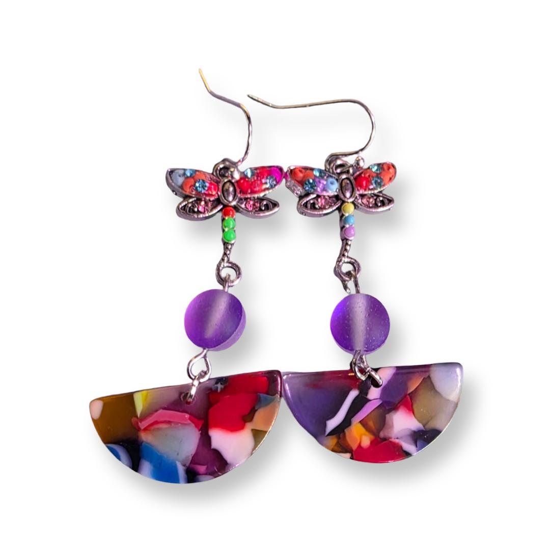 Playful abstract earring set of 3 designed with multi-colored acrylic shapes, frosted-glass moon beads, and dragonfly charms. Length is 2 inches. SKU EL2ST1STYD *See more designs at: prettybeaddezigns.com
