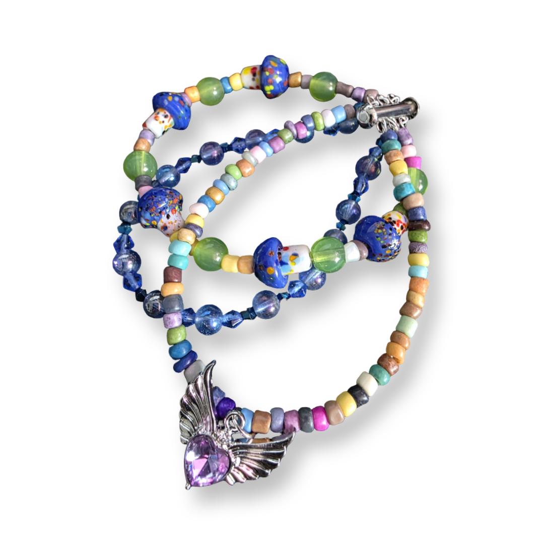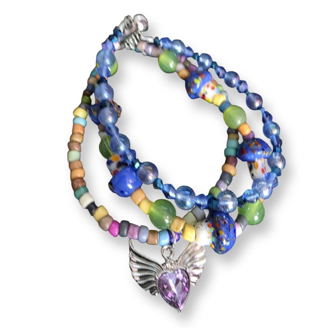 This multi-strand bracelet is a vibrant and eclectic piece that captures a playful, bohemian spirit. It features a mix of multicolored beads of ceramic, wood, and glass with a silver wing-shaped charm adorned with a purple, heart-shaped gemstone at its center. The slide clasp has a strong magnet. See more handmade designs at: www.prettybeaddezigns.com