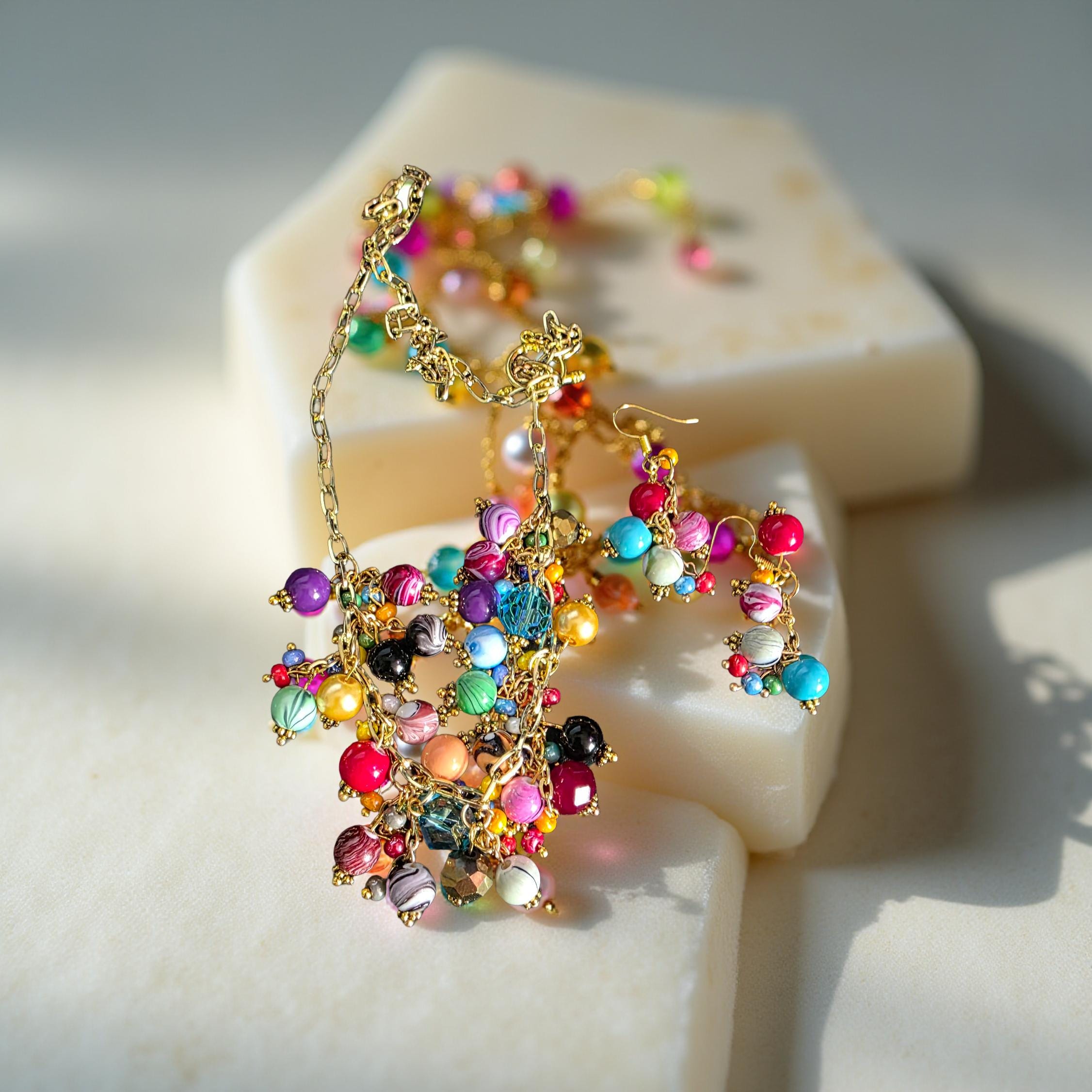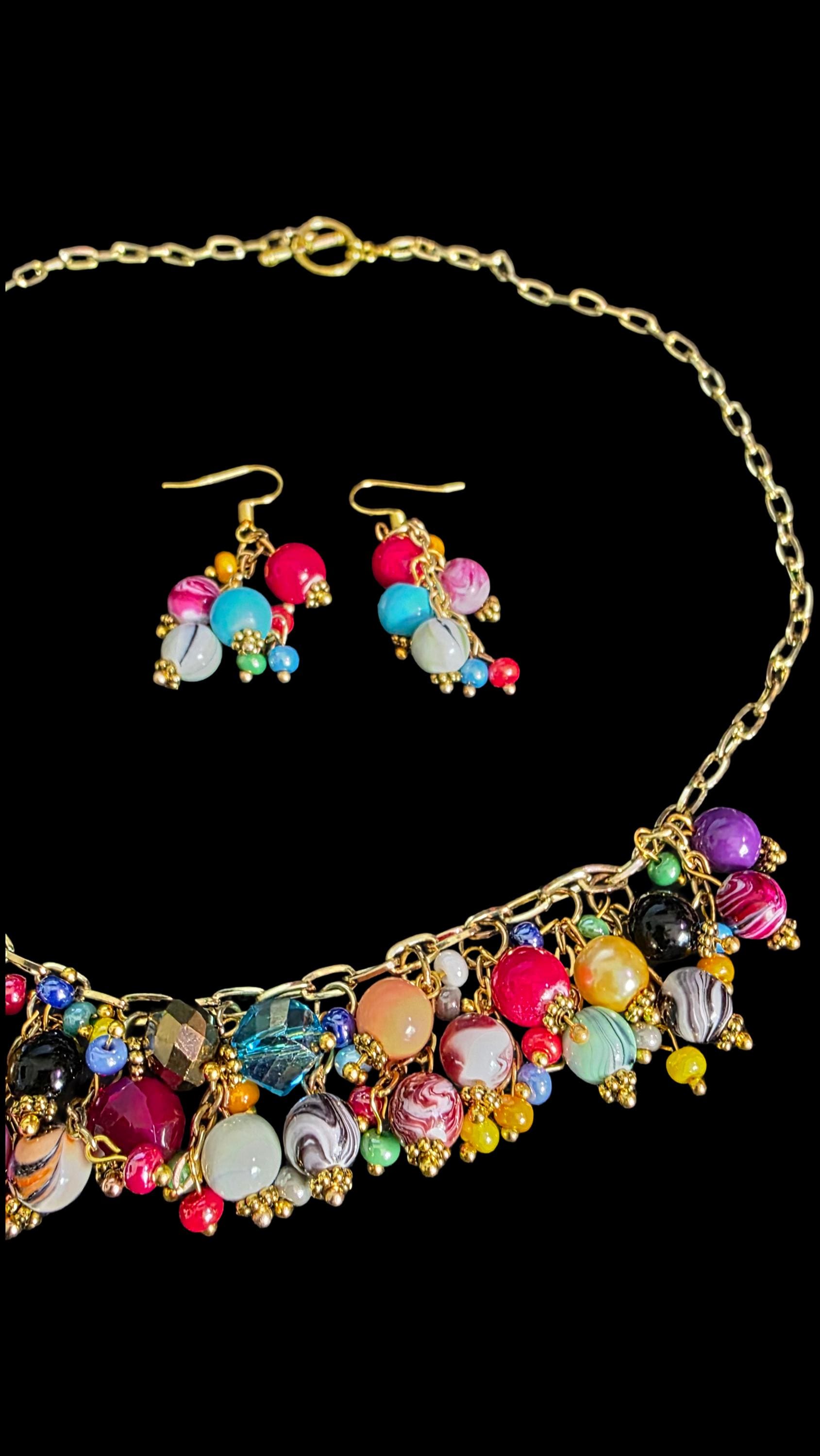 Vibrant beaded necklace and matching earrings handmade with colorful glass bead chandeliers on a goldtone chain, and a toggle clasp in front. The length is 18 inches. SKUN18S1SP. See more creations at: www.prettybeaddezigns.com