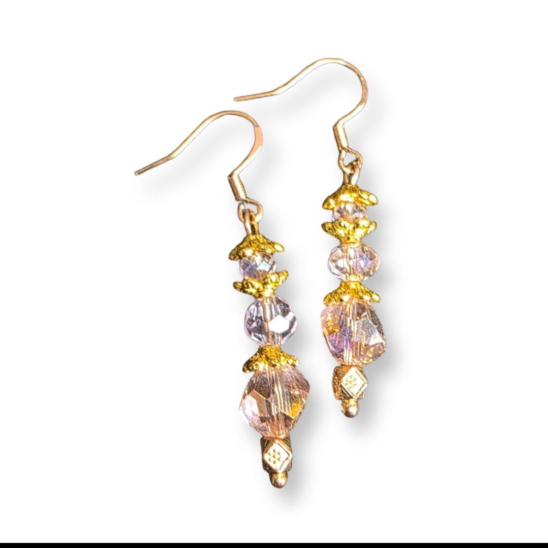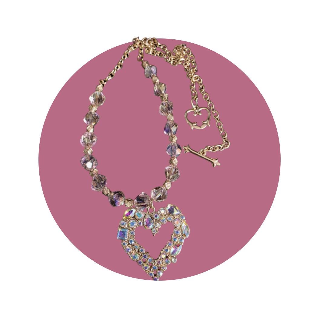 This sparkling, dainty heart necklace set was handmade with a pink-and-gold rhinestone-embedded heart pendant, crystal pink glass beads, and gold spacers on a gold-tone chain, finished with a gold heart toggle clasp. Perfect for Valentine's Day! The length is 18 inches. See more designs at: prettybeaddezigns.com