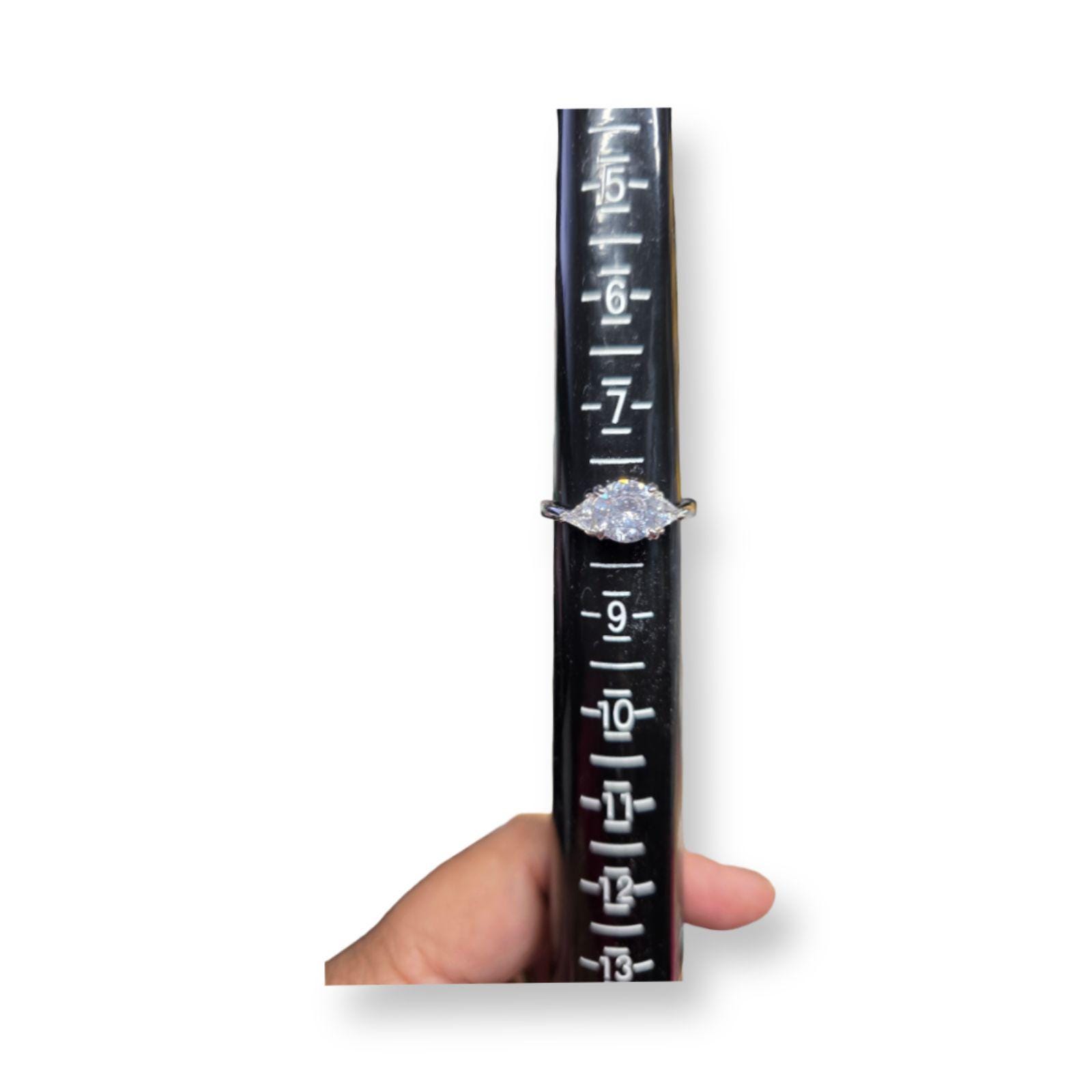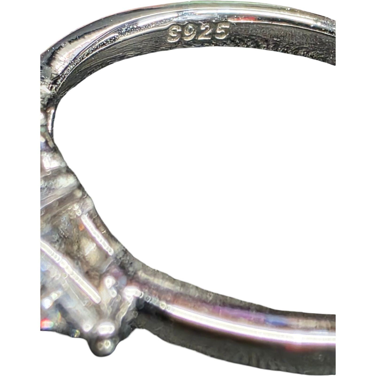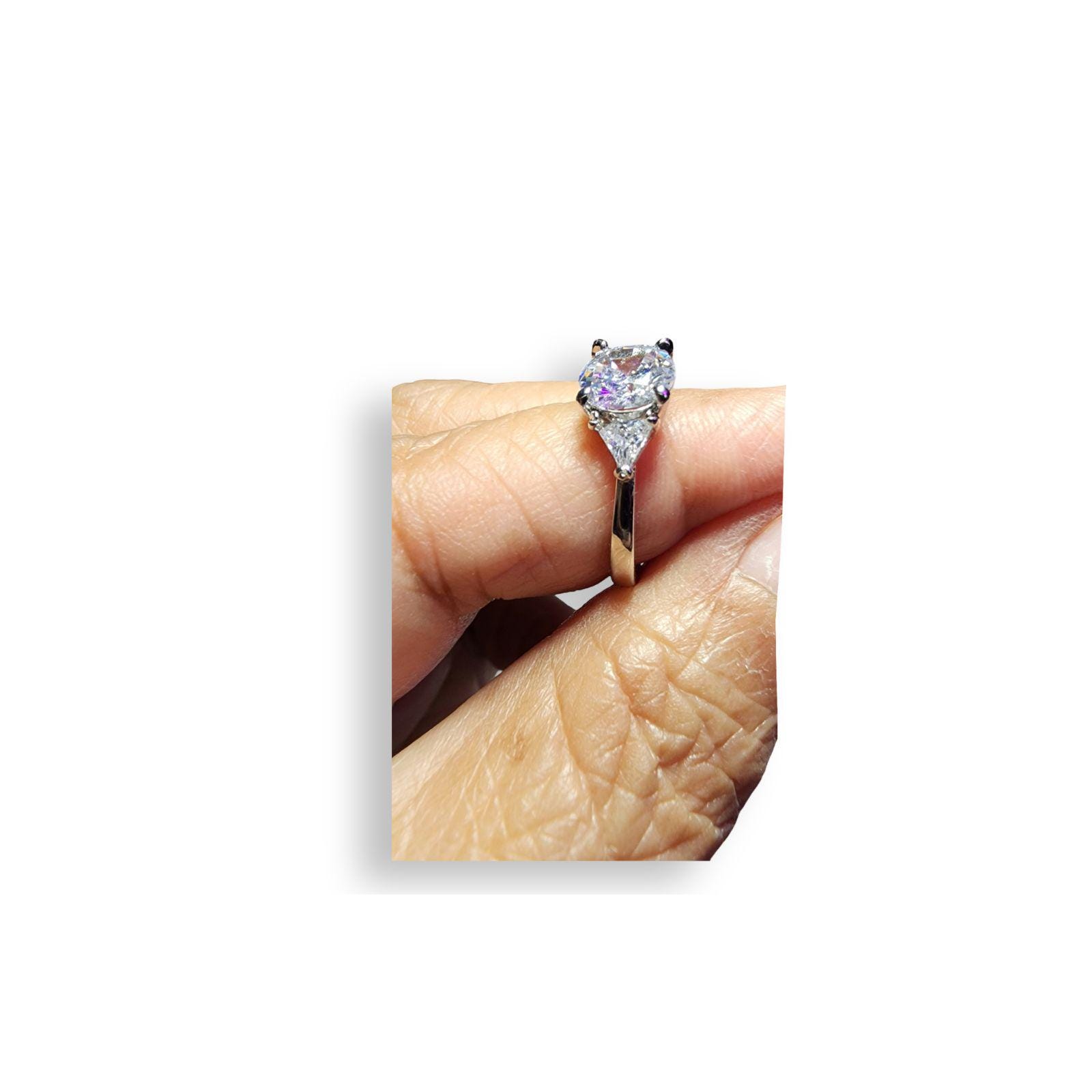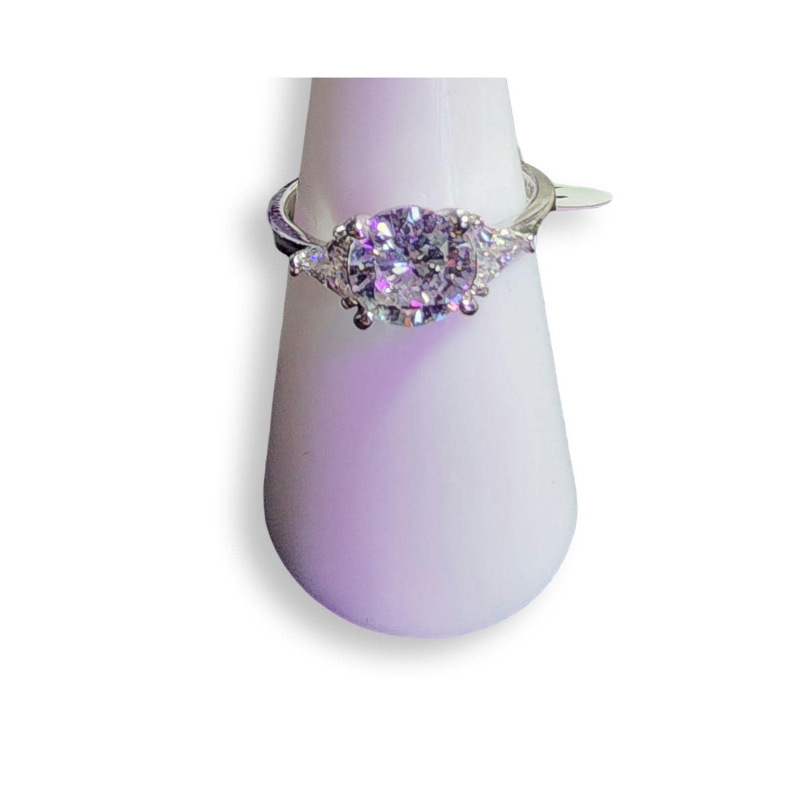 This ring is a 925 sterling silver natural 2.0 ct moissanite fashion engagement ring featuring a large round brilliant-cut center stone flanked by two triangular-shaped trillion accent stones on either side. No certificate. Size 8